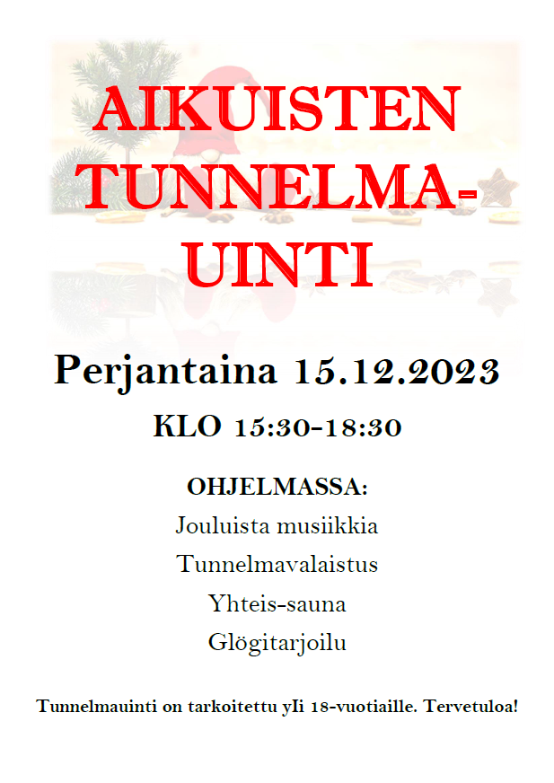 Lue lisääPe 12.12. klo 16-18.30. Tunnelmamusiikkia ja -valaistus. Veden Kaiku- äänimaisemakonsertti (Antti Koukonen) Klo 17.30-18.30. Tunnelmauinti on tarkoitettu yIi 18-vuotiaille. Tervetuloa!