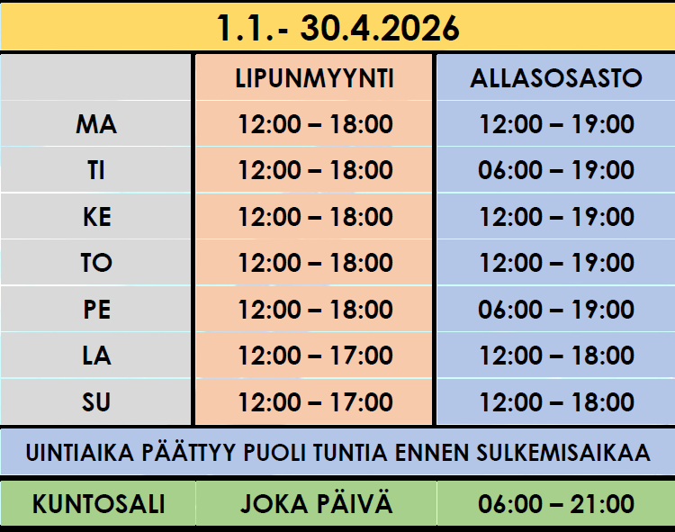Lipunmyynnin aukioloaikojen ulkopuolisina aikoina kuntosalille ja allasosastolle kulkemiseen tarvitset ennalta ostetut lipputuotteet.