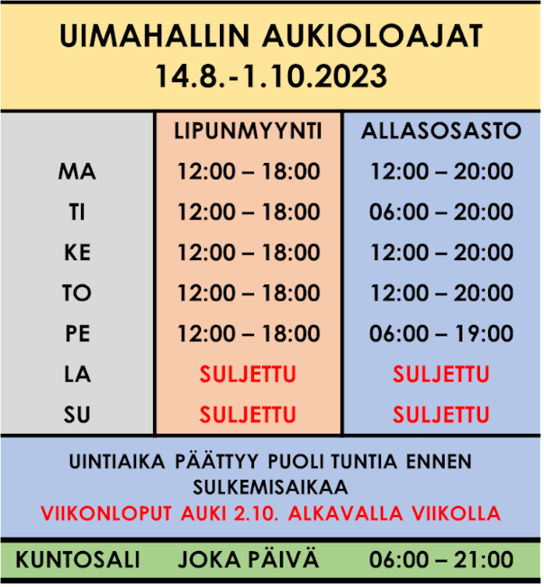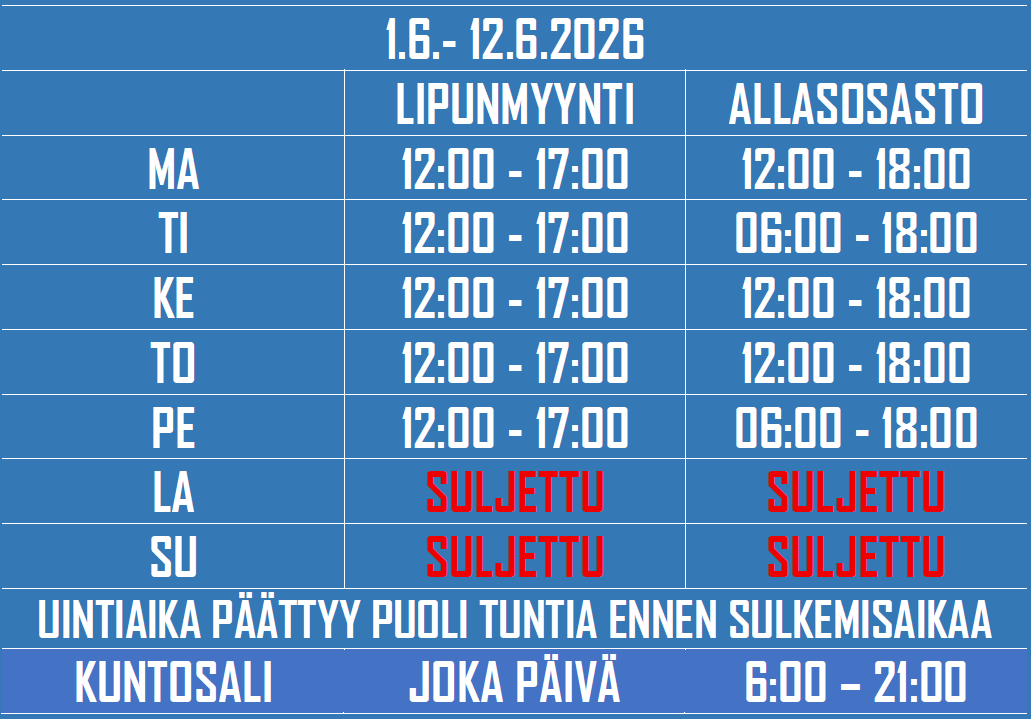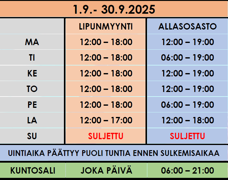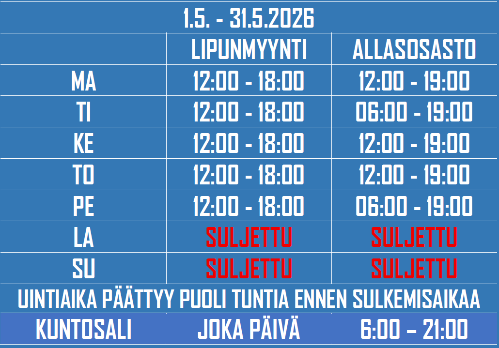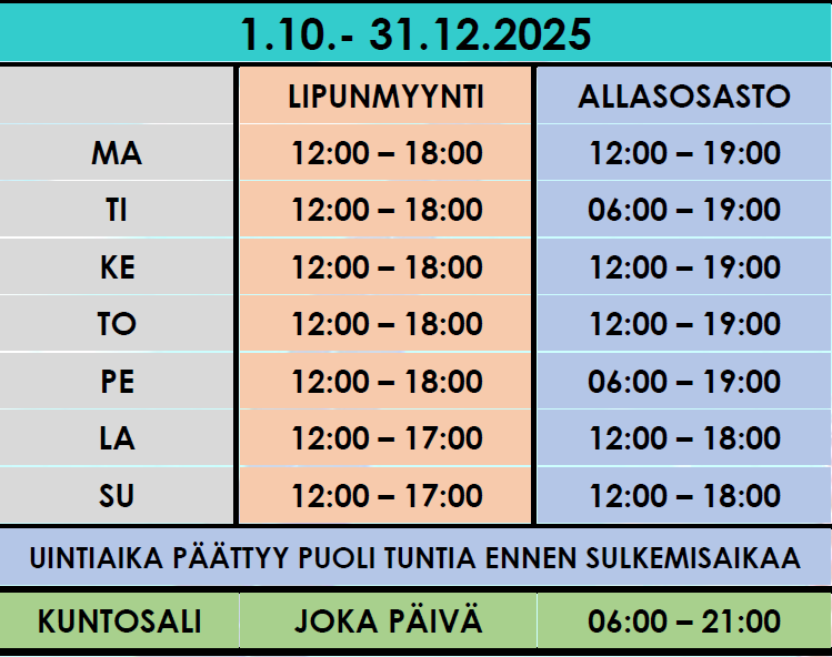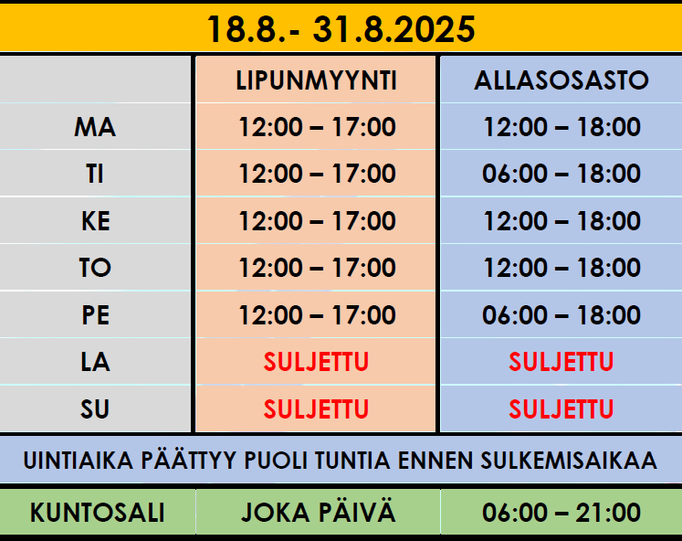 Lipunmyynnin aukioloaikojen ulkopuolisina aikoina kuntosalille ja allasosastolle kulkemiseen tarvitset ennalta ostetut lipputuotteet.